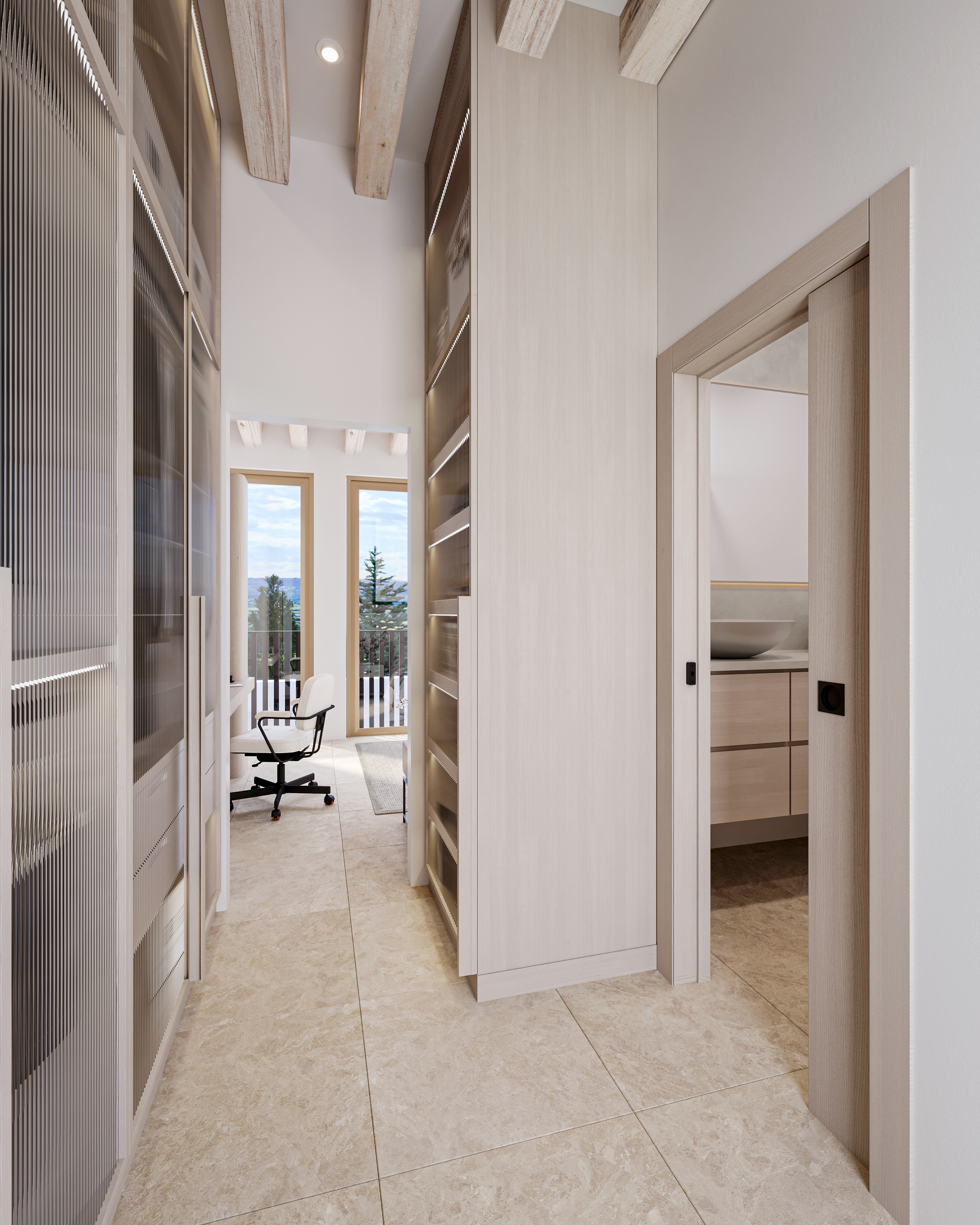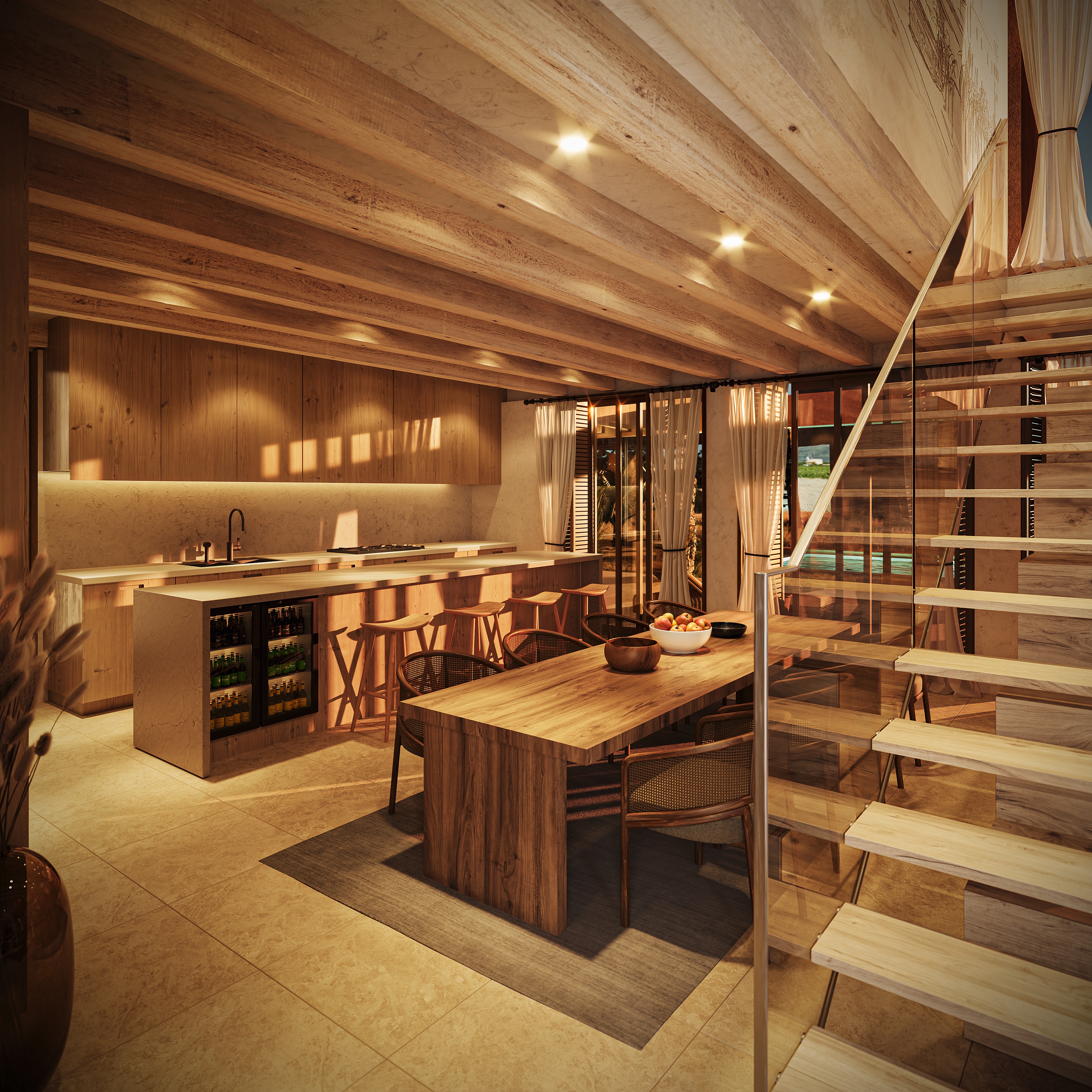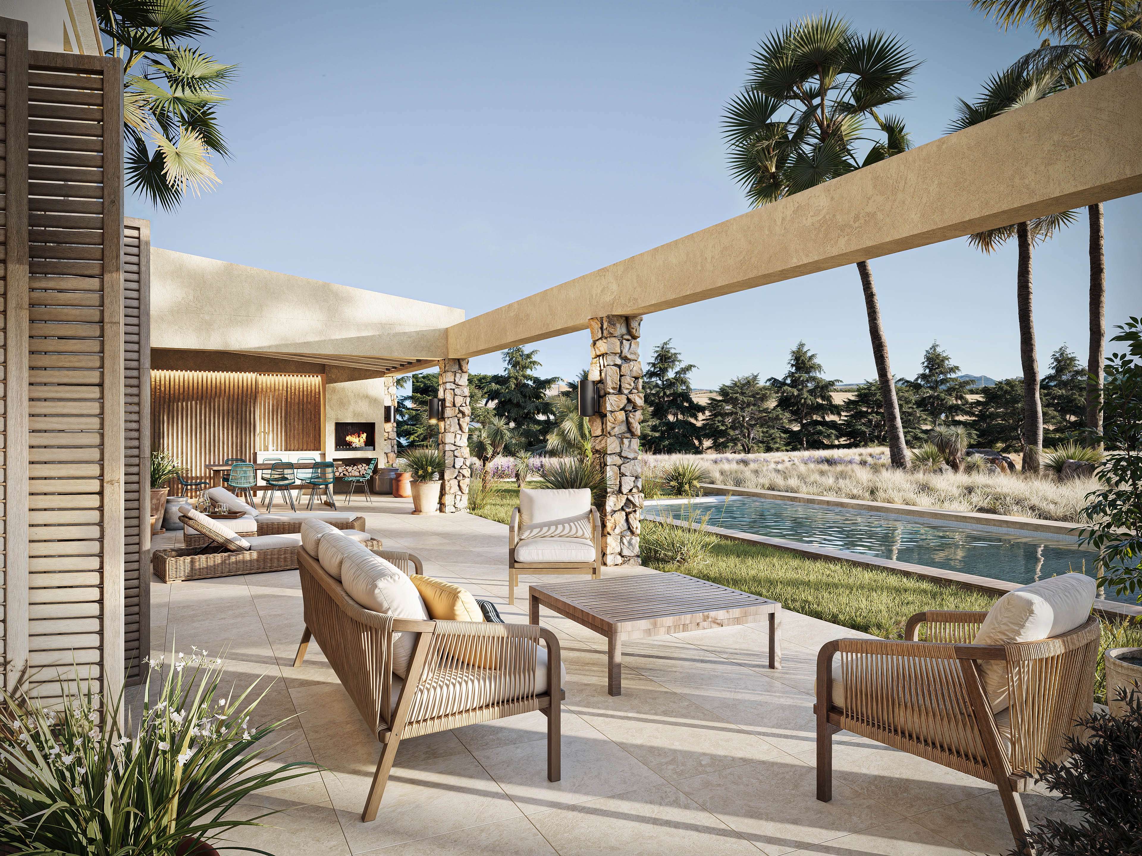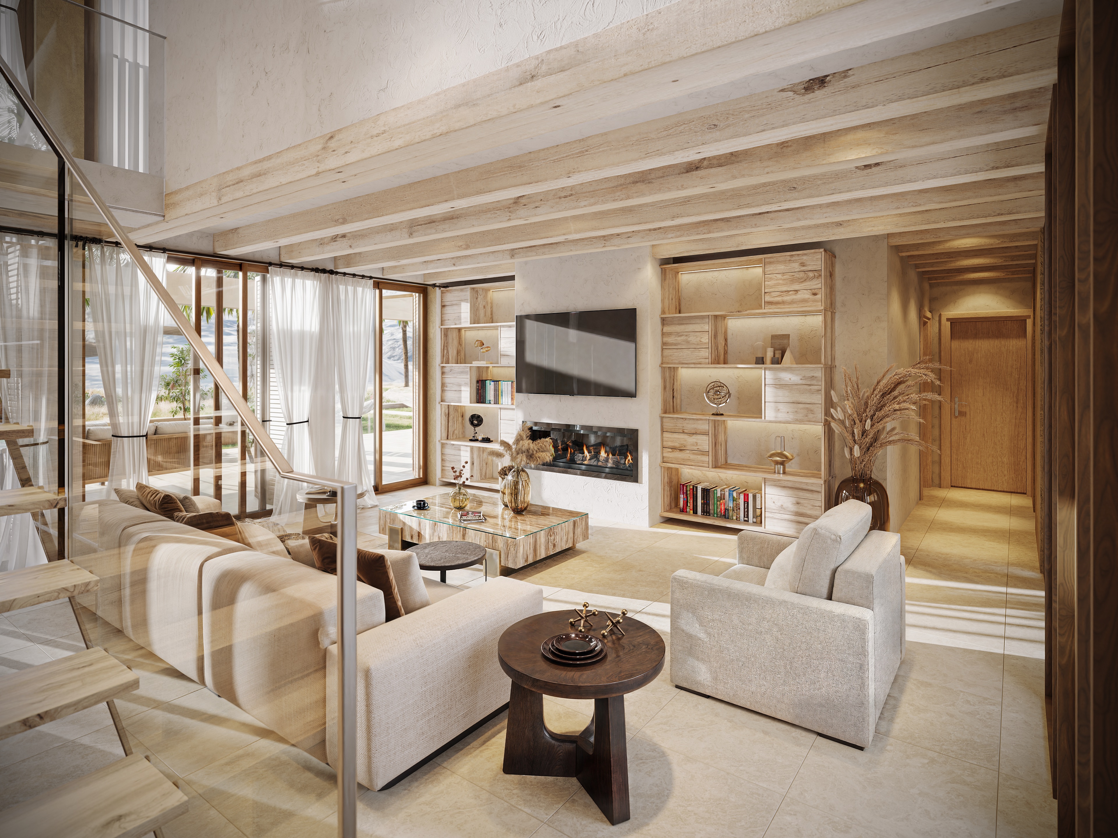 La distribución incluye cuatro amplios dormitorios y cuatro baños, tres de ellos en suite, que brindan privacidad y comodidad a la familia e invitados. Una cocina abierta se integra a la perfección con el salón, equipado con chimenea y calefacción por suelo radiante para disfrutar de la calidez durante todo el año. Un lavadero independiente aporta una práctica comodidad.